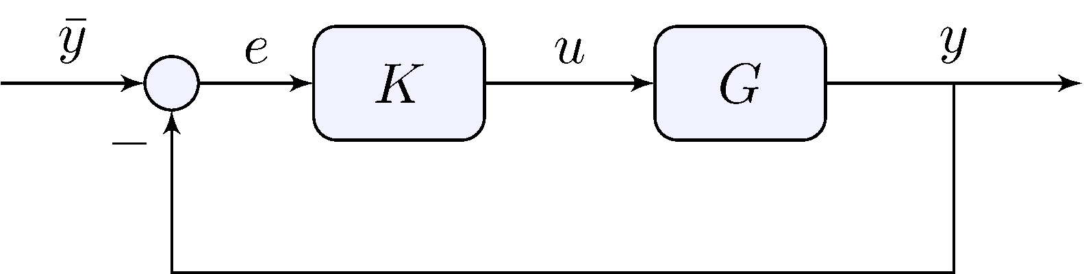 \[\begin{align*} y &= G \, u, & u &= K \, e, & e &= \bar{y} - y \end{align*}\] Eliminate \(e\) and \(u\): \[\begin{align*} y &= G K e = G K (\bar{y} - y) & &\implies & (1 + G K) y &= G K \bar{y} \end{align*}\] If \(G K \neq 1\) \[\begin{align*} y &= H \bar{y}, & H &= \frac{G K}{1 + G K} \end{align*}\]