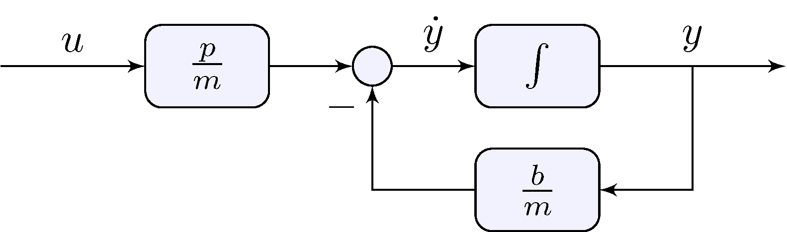 \[\begin{align*} \dot{y}(t) &= \frac{p}{m} u(t) - \frac{b}{m} \, y(t) \end{align*}\]