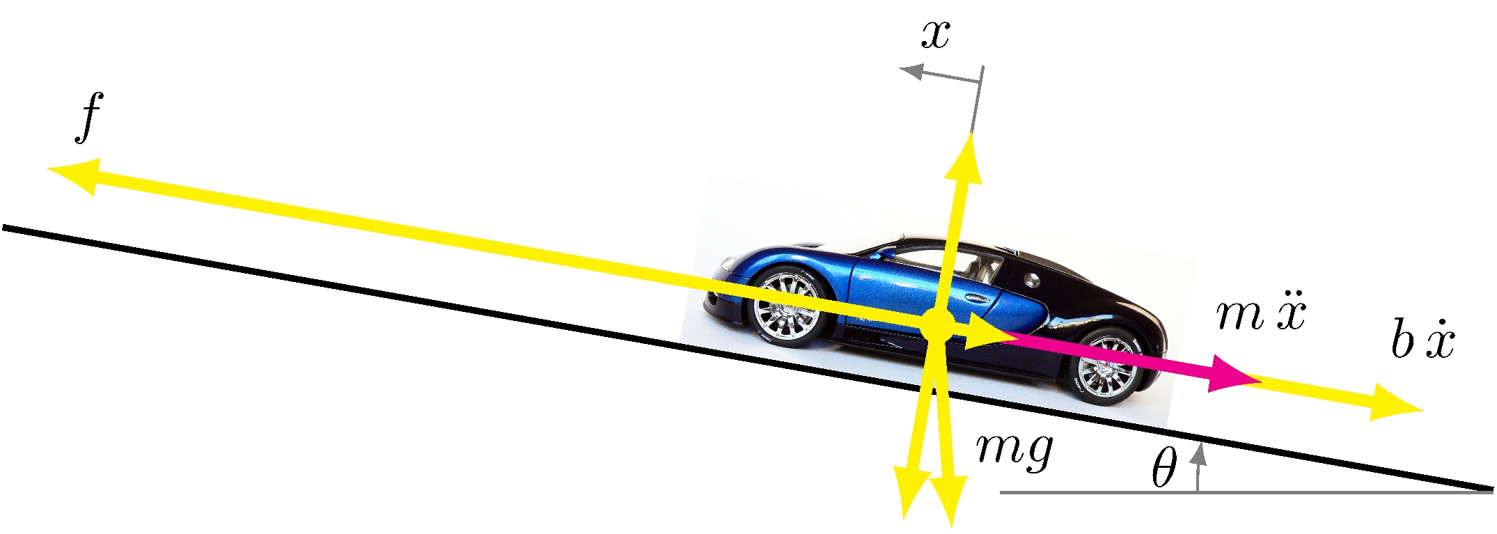 \[\begin{align*} \dot{y}(t) + \frac{b}{m} \, y(t) = \frac{p}{m} u(t) - g \sin (\theta(t)) \end{align*}\]