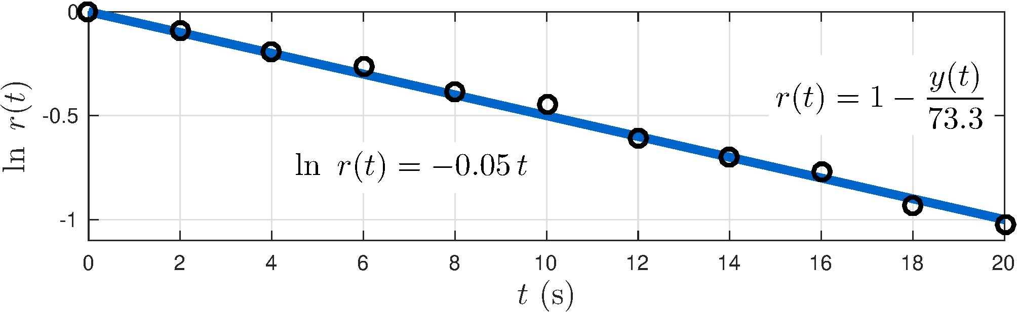 \[\begin{align*} r(t) &= 1 - \left. y(t) \middle/ \tilde{y} \right . = e^{\lambda t} & & \implies & \ln r(t) &= \lambda t \end{align*}\]