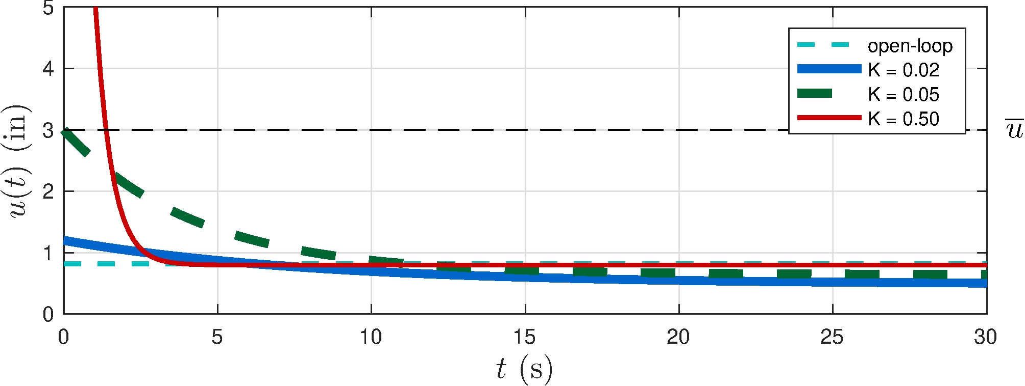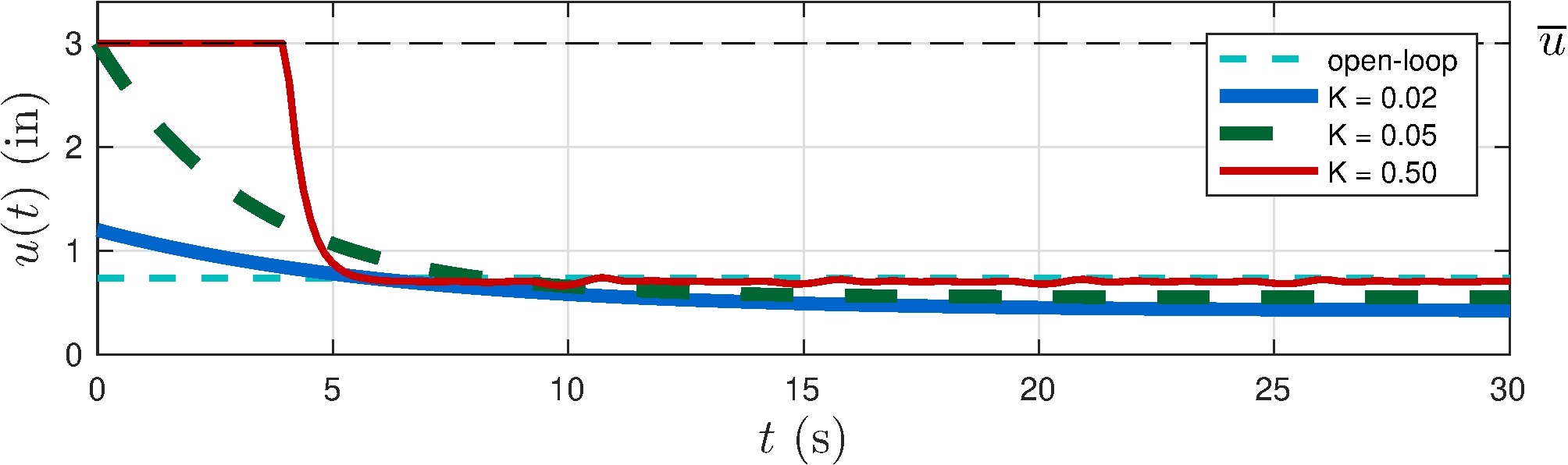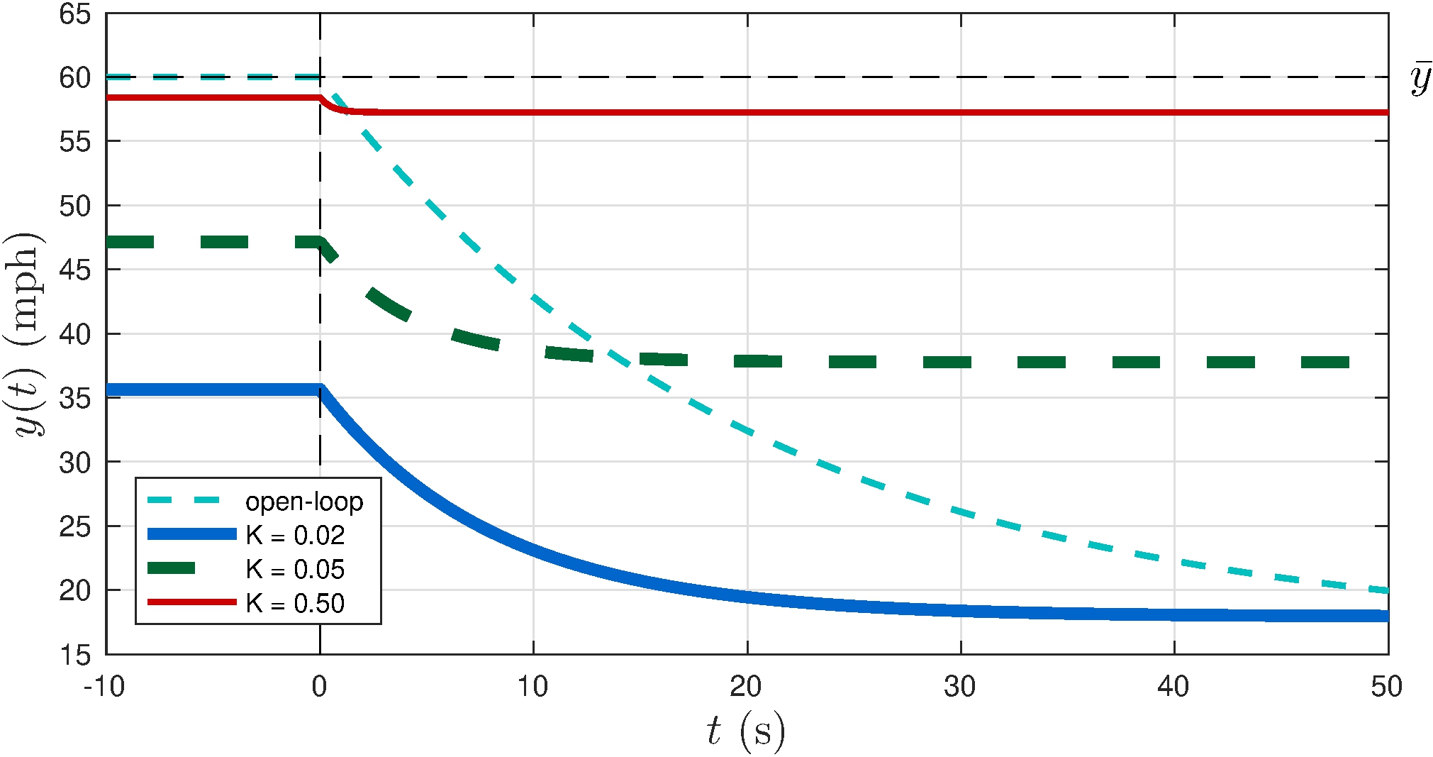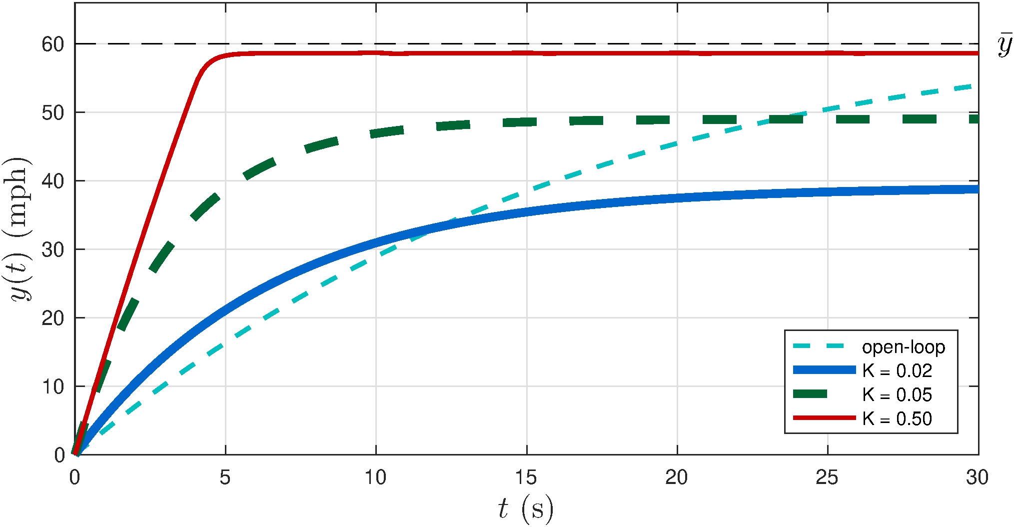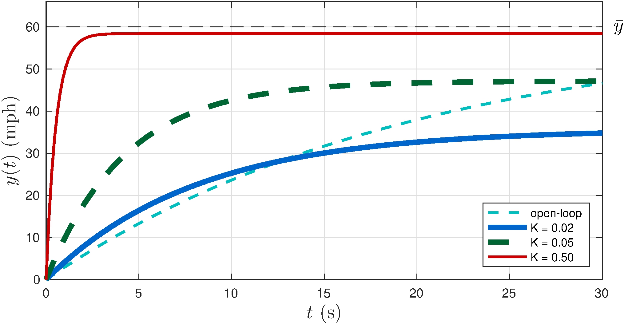 \(\bar{y} = 60 \text{ mph } \implies u(t) > \bar{u} = 3 \text{ in for } K > 0.05\)!