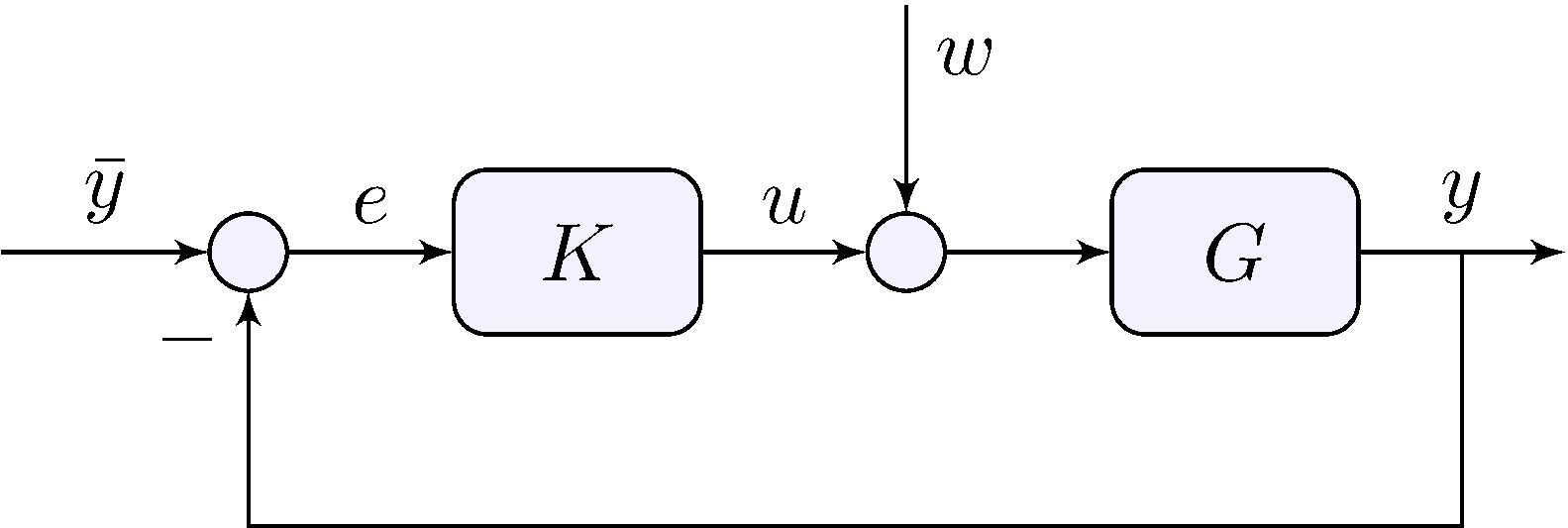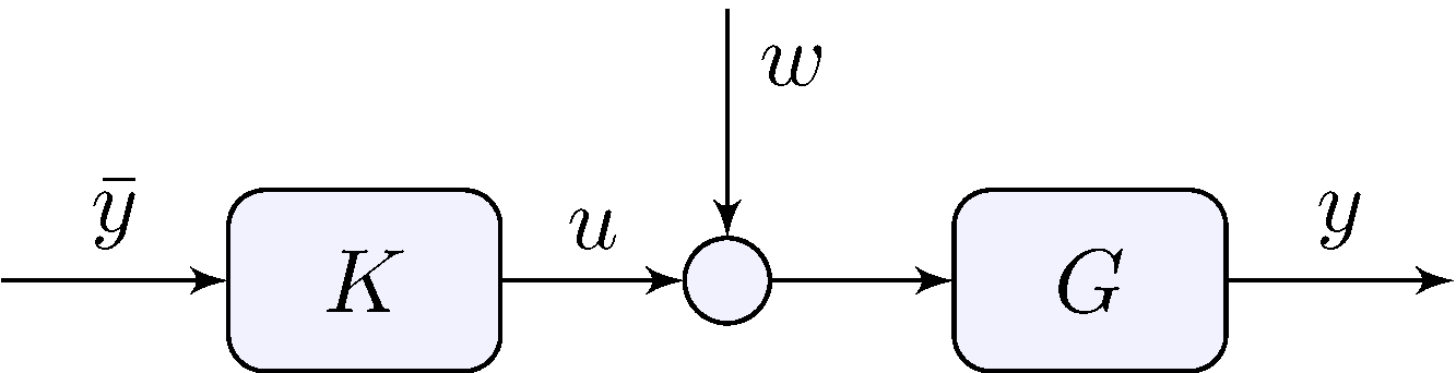 \[\begin{align*} y &= G \, (u + w), & u &= K \, \tilde{e}, & \tilde{e} &= \bar{y} - (y + v) \end{align*}\]