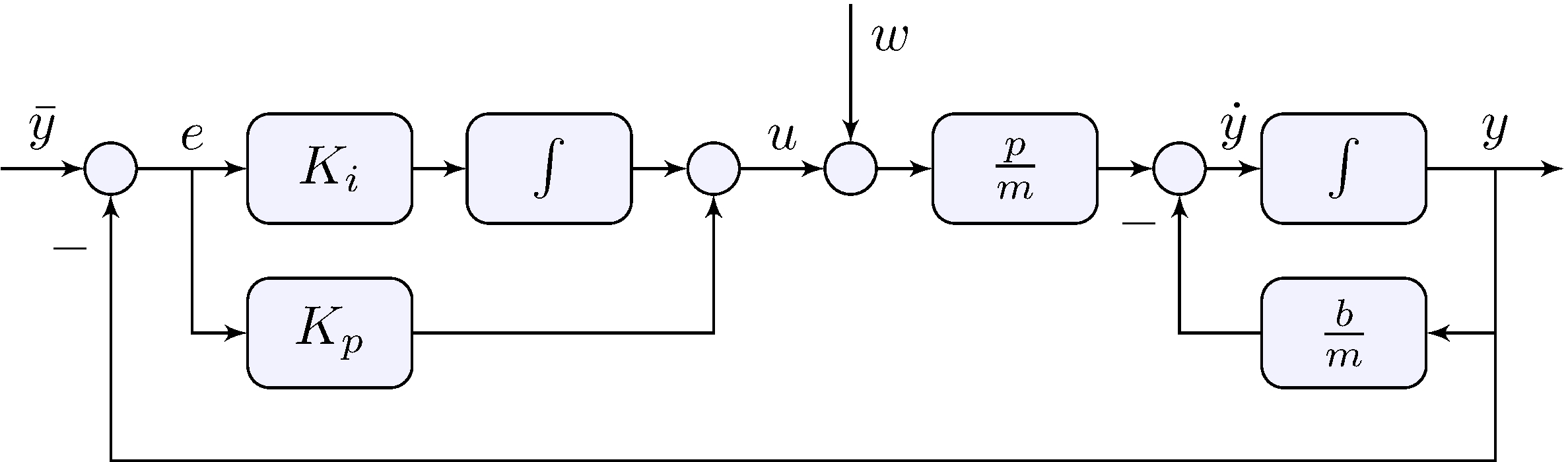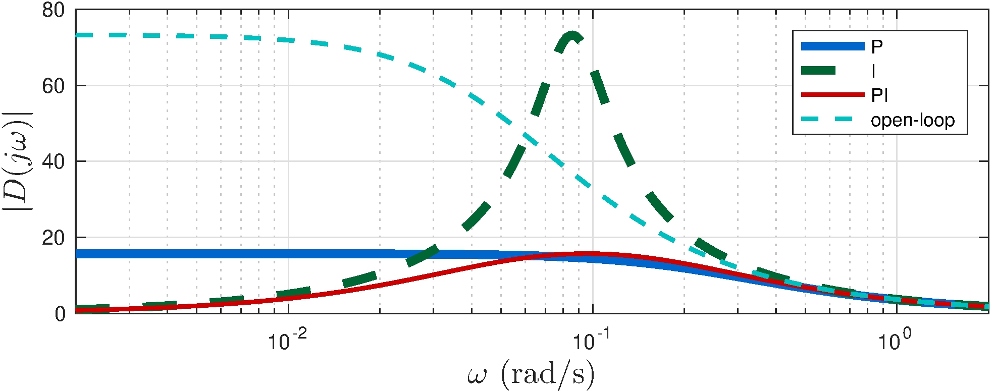 \[\begin{align*} K_i &= \frac{b}{m} K_p, & K(s) &= K_p + \frac{K_i}{s} = K_p \frac{s + \frac{b}{m}}{s} \end{align*}\] leads to a pole-zero cancellation \[\begin{align*} G(s) \, K(s) &= \frac{\frac{p}{m}}{s +\frac{b}{m}} \times K_p \frac{s + \frac{b}{m}}{s} = \frac{\frac{p}{m} K_p}{s}, \end{align*}\]