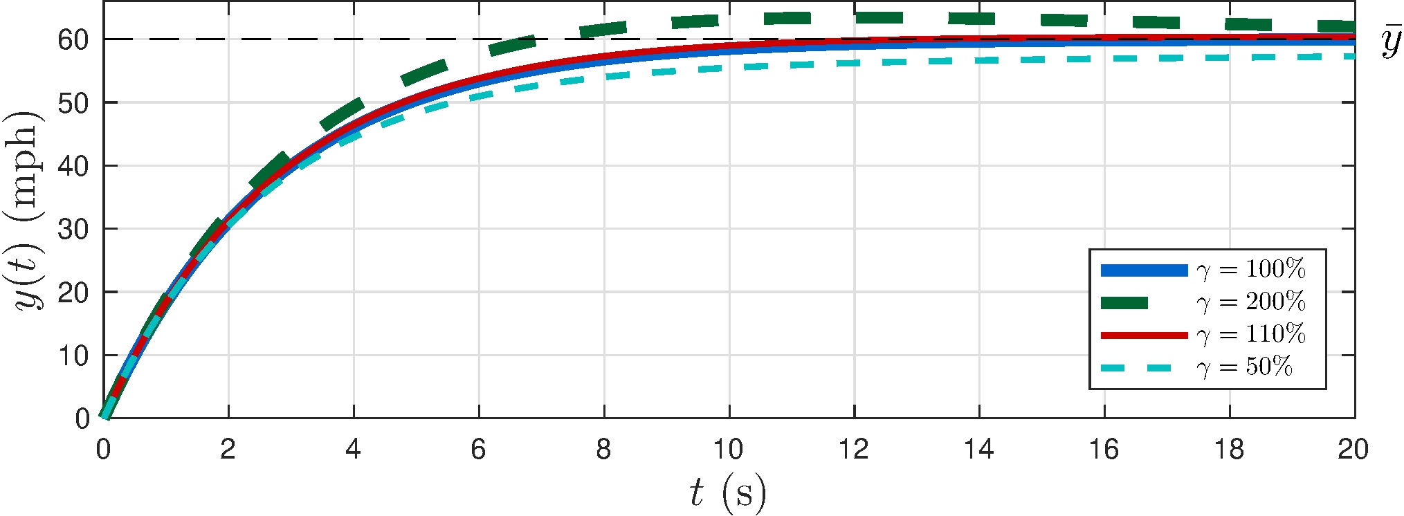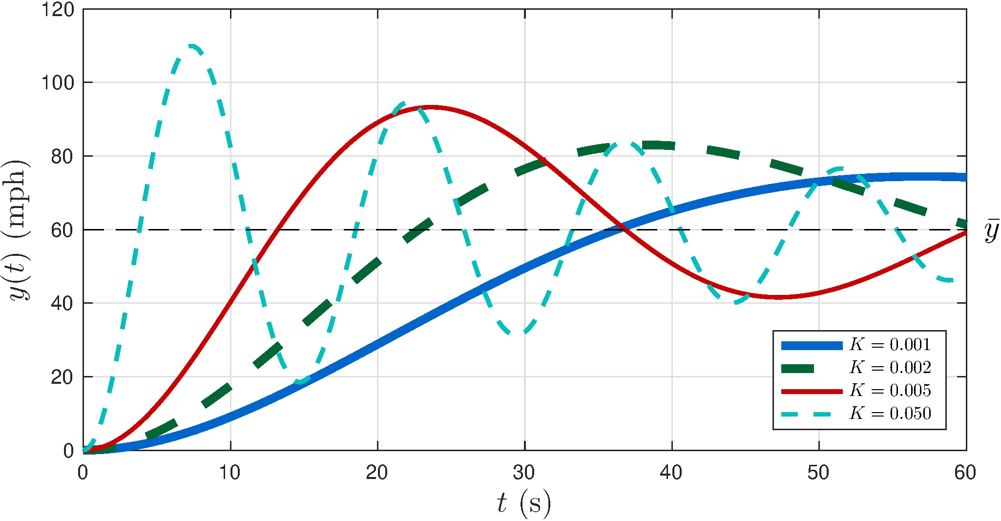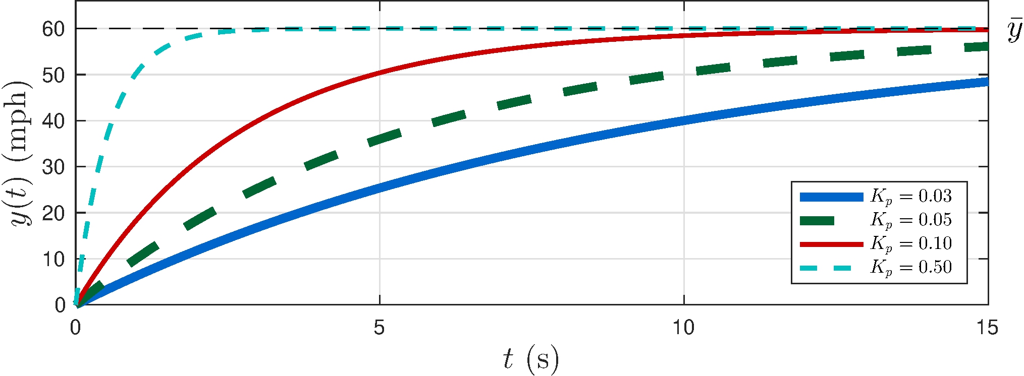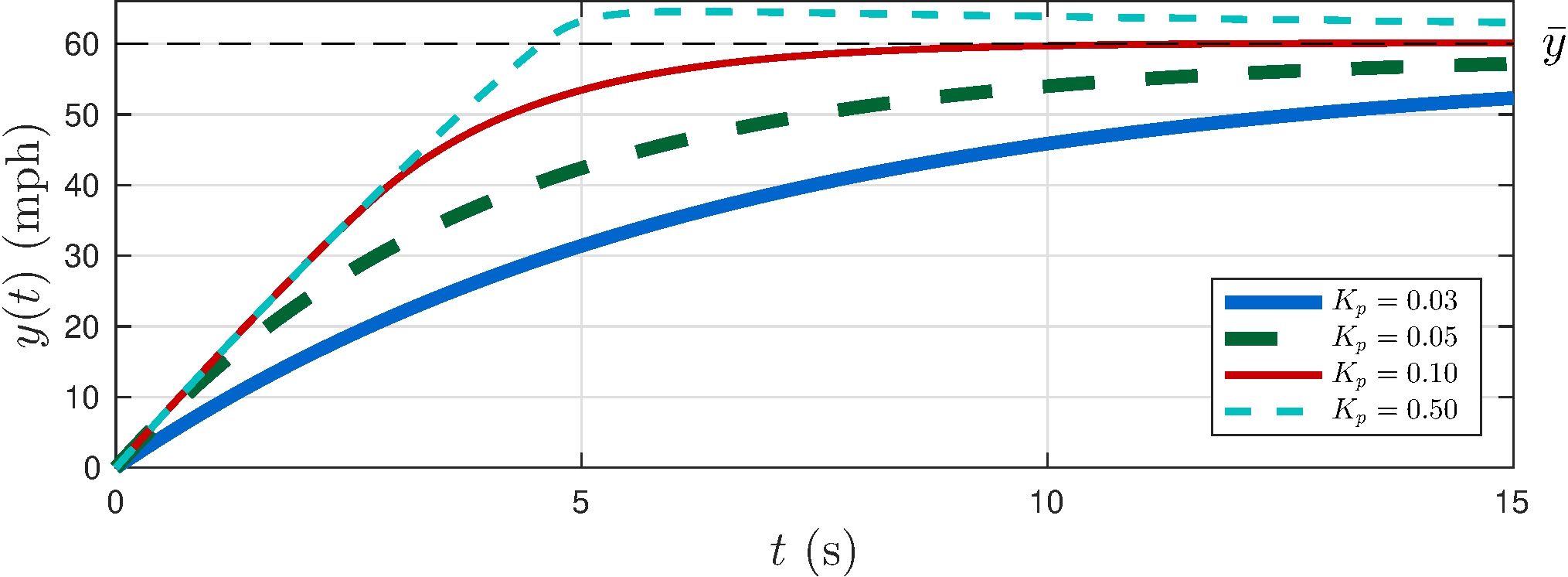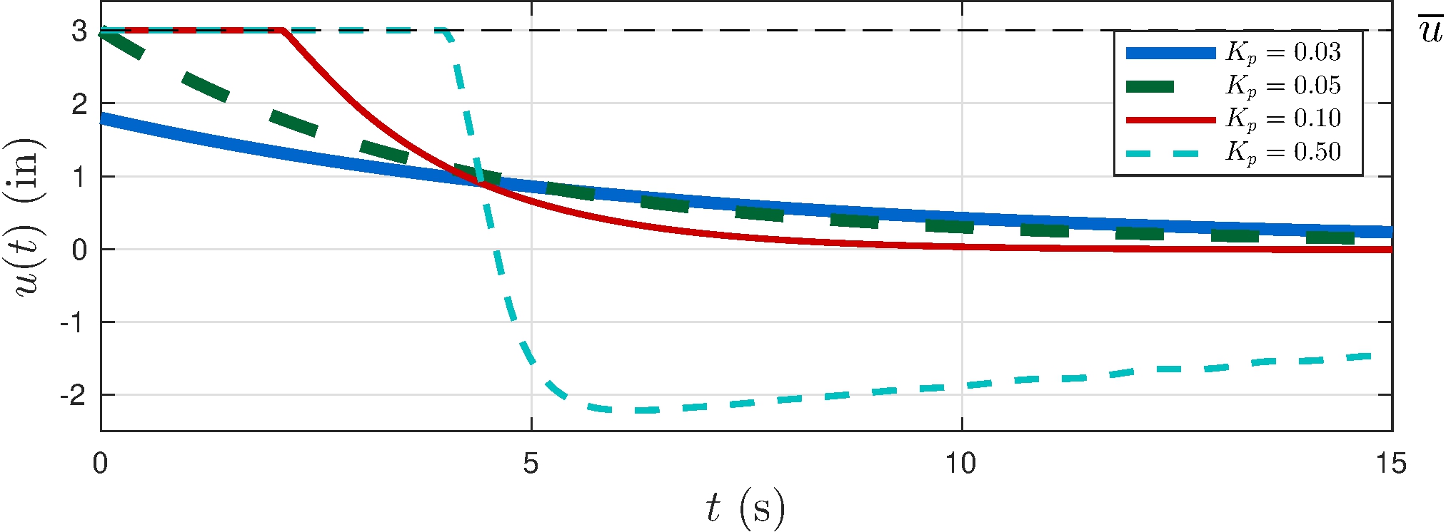 Beware of control effort: saturation occurs if \[\begin{align*} K_p > \frac{\overline{u}}{\bar{y}} = \frac{3}{60} = 0.05 \end{align*}\]