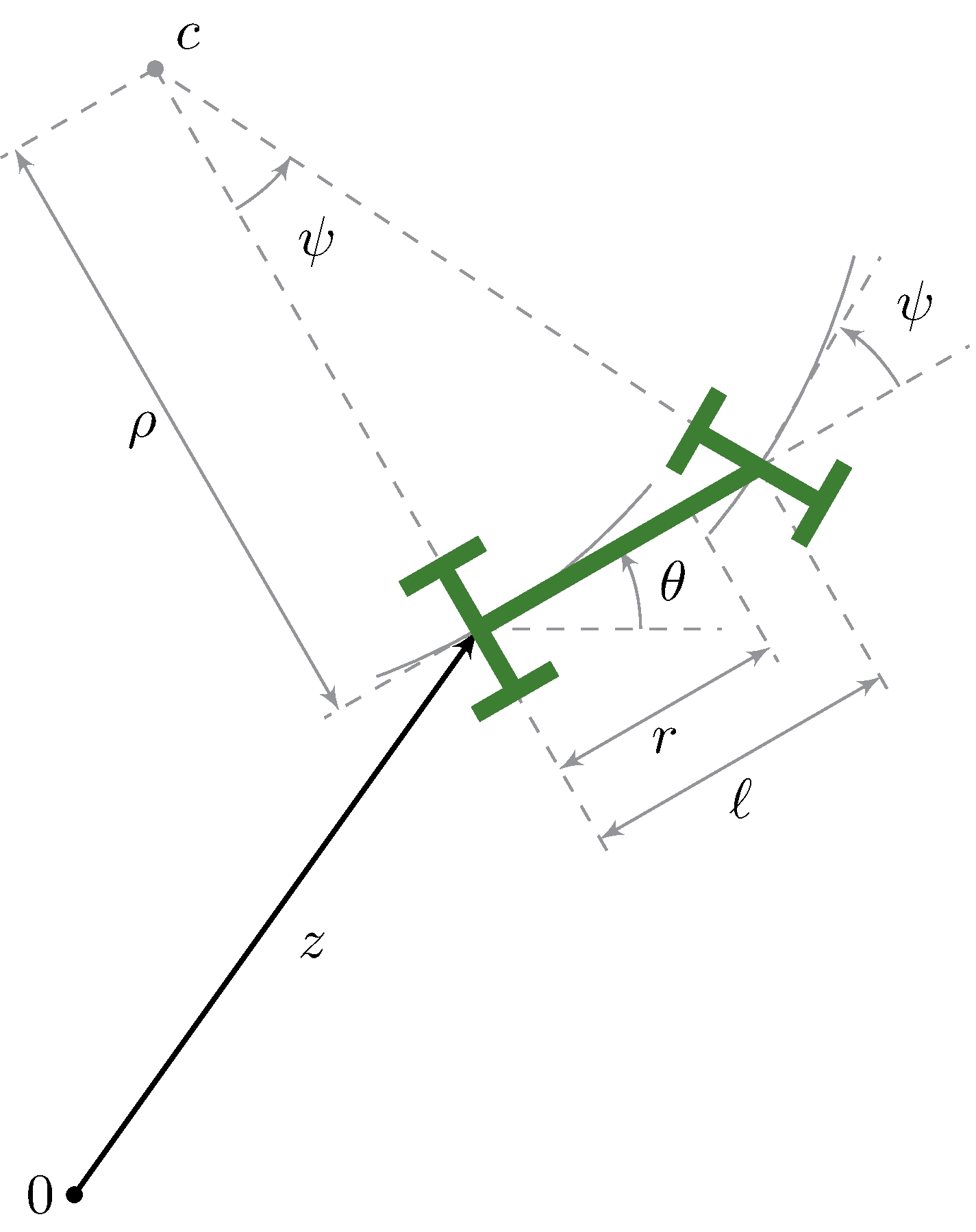 \[\begin{align*} x &= \begin{pmatrix} z_x \\ z_y \\[.5ex] \theta \end{pmatrix}, & u &= \tan \psi, & f(x, u) &= \begin{pmatrix} v \cos \theta \\ v \sin \theta \\ \displaystyle u {v}/{\ell} \end{pmatrix} \end{align*}\]