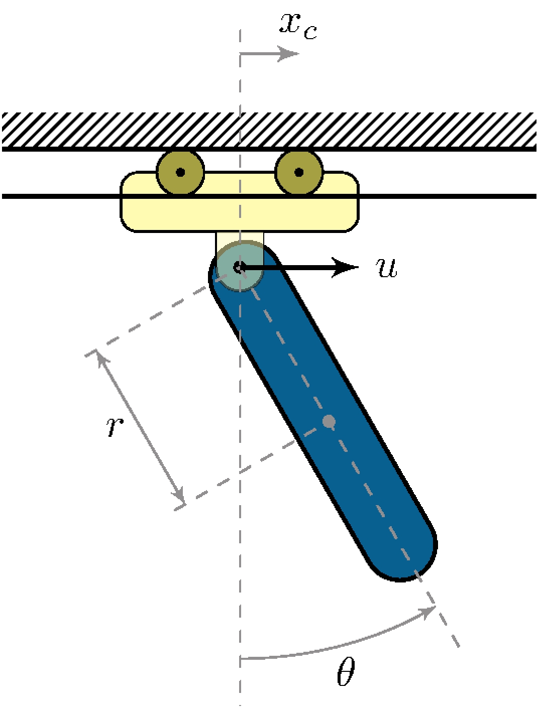 \[\begin{align*} M(q) \, \ddot{q} + F(q, \dot{q}) &= G u, & q &= \begin{pmatrix} \theta \\ x_c \end{pmatrix} \end{align*}\] \[\begin{align*} M(q) &= \begin{bmatrix} J_p + m_p \, r^2 & m_p \, r \cos q_1 \\ m_p \, r \cos q_1 & m_p + m_c \end{bmatrix}, & F(q,\dot{q}) &= \begin{pmatrix} b_p \dot{q}_1 + m_p \, g \, r \sin q_1 \\ b_c \dot{q}_2 - m_p \, r \, \dot{q}_1^2 \sin q_1 \end{pmatrix}, & G &= \begin{pmatrix} 0 \\ 1 \end{pmatrix} \end{align*}\]