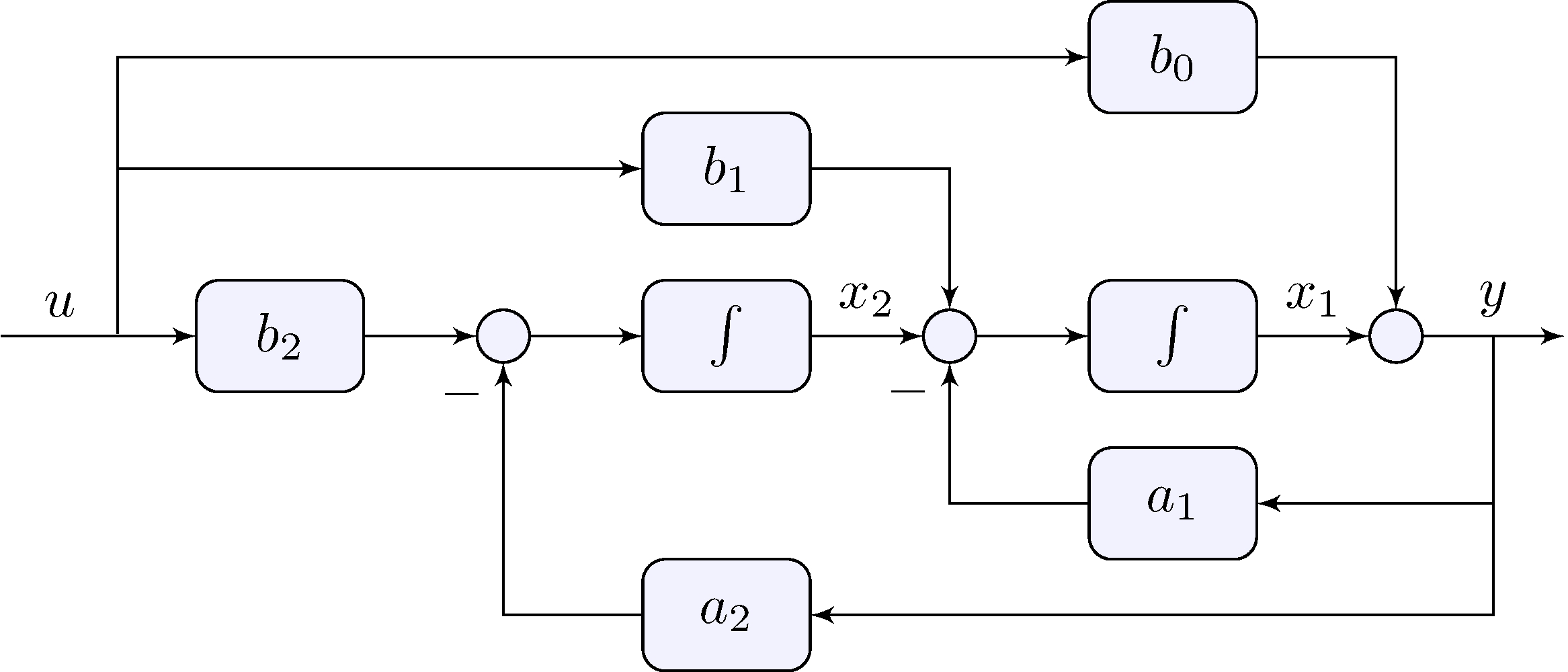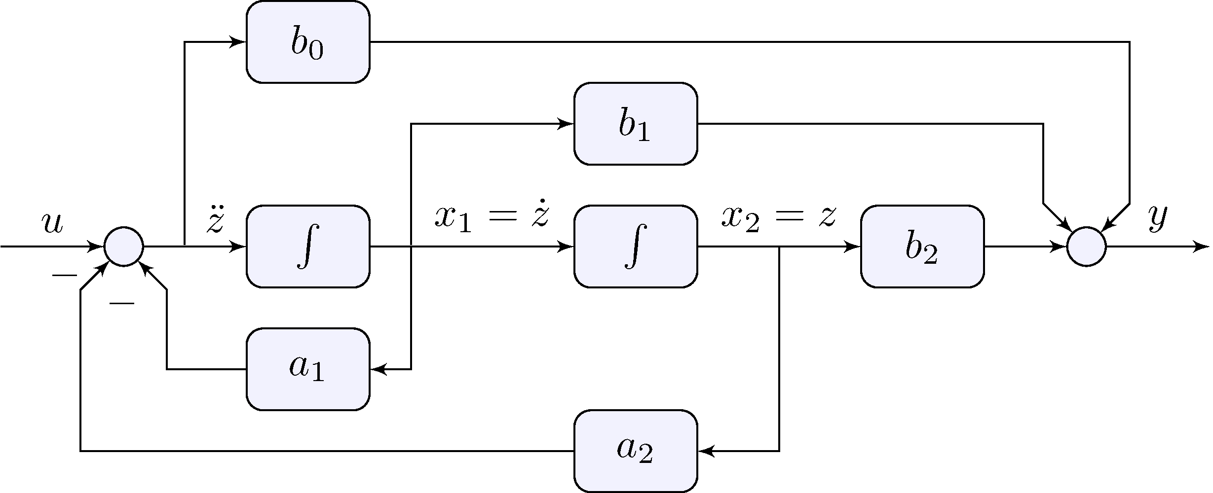\[\begin{align*} \ddot{y} + a_1 \dot{y} + a_2 \, y &= u_0 + u_1 + u_2, & u_0 &= b_0 \ddot{u}, & u_1 &= b_1 \dot{u}, & u_2 &= b_2 u \end{align*}\] can be broken down into \[\begin{align*} \ddot{z} + a_1 \dot{z} + a_2 \, z &= u, & y &= b_0 \ddot{z} + b_1 \dot{z} + b_2 z \end{align*}\]