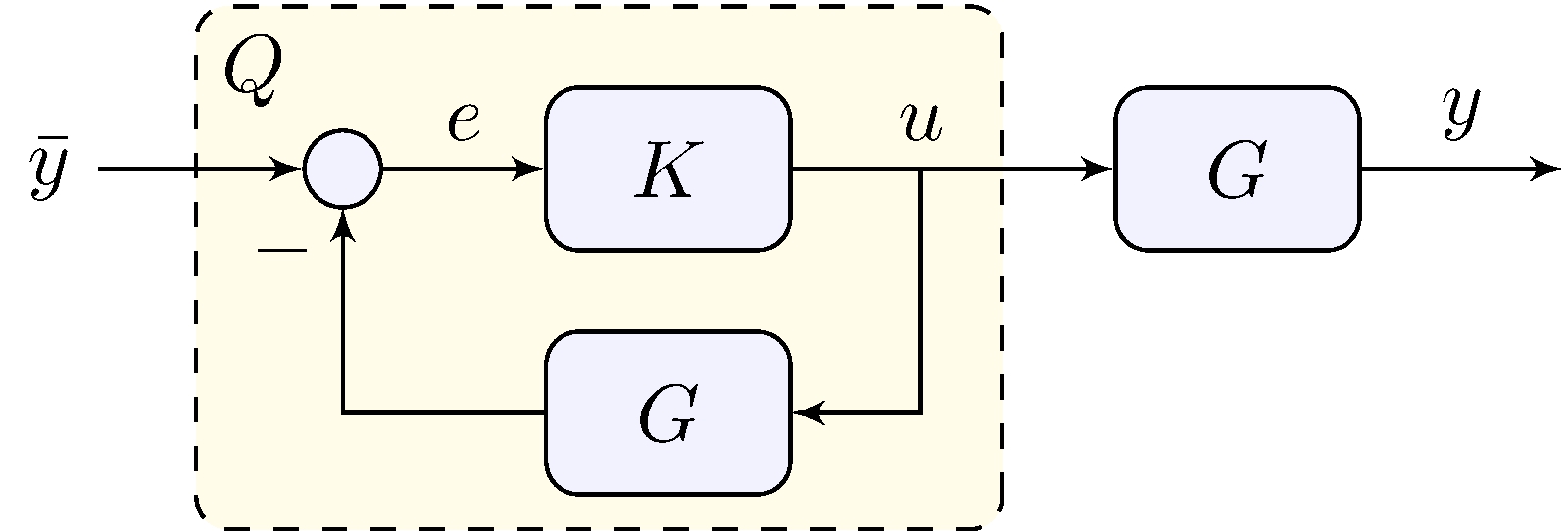 \[\begin{align*} K &\text{ is stabilizing} & & \implies & Q &= \frac{K}{1 + K \, G} \text{ is asymptotically stable} \\ Q &\text{ is asymptotically stable} & & \implies & K &= \frac{Q}{1 - Q \, G} \text{ is stabilizing} \end{align*}\]