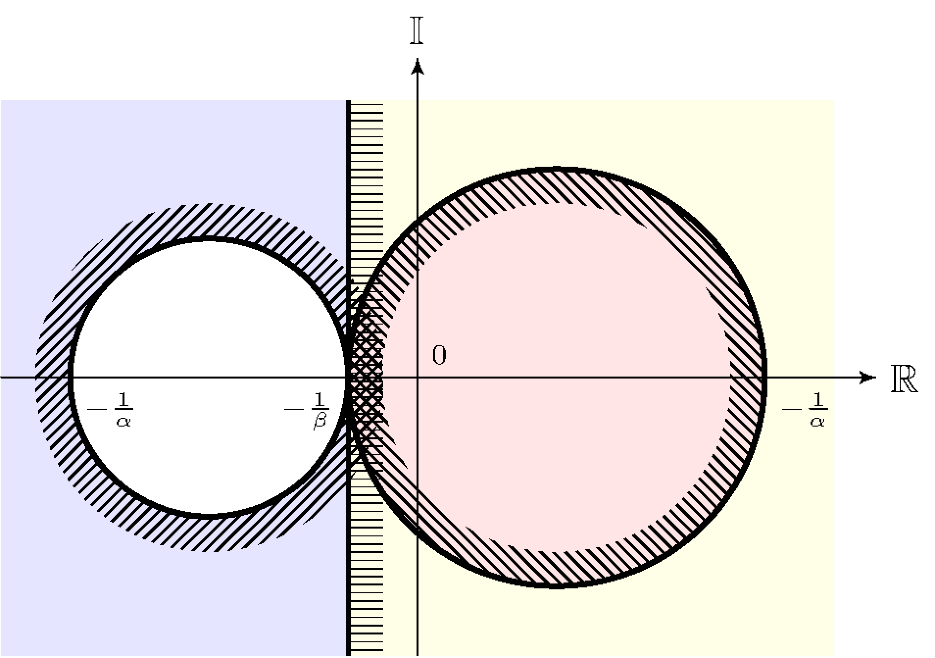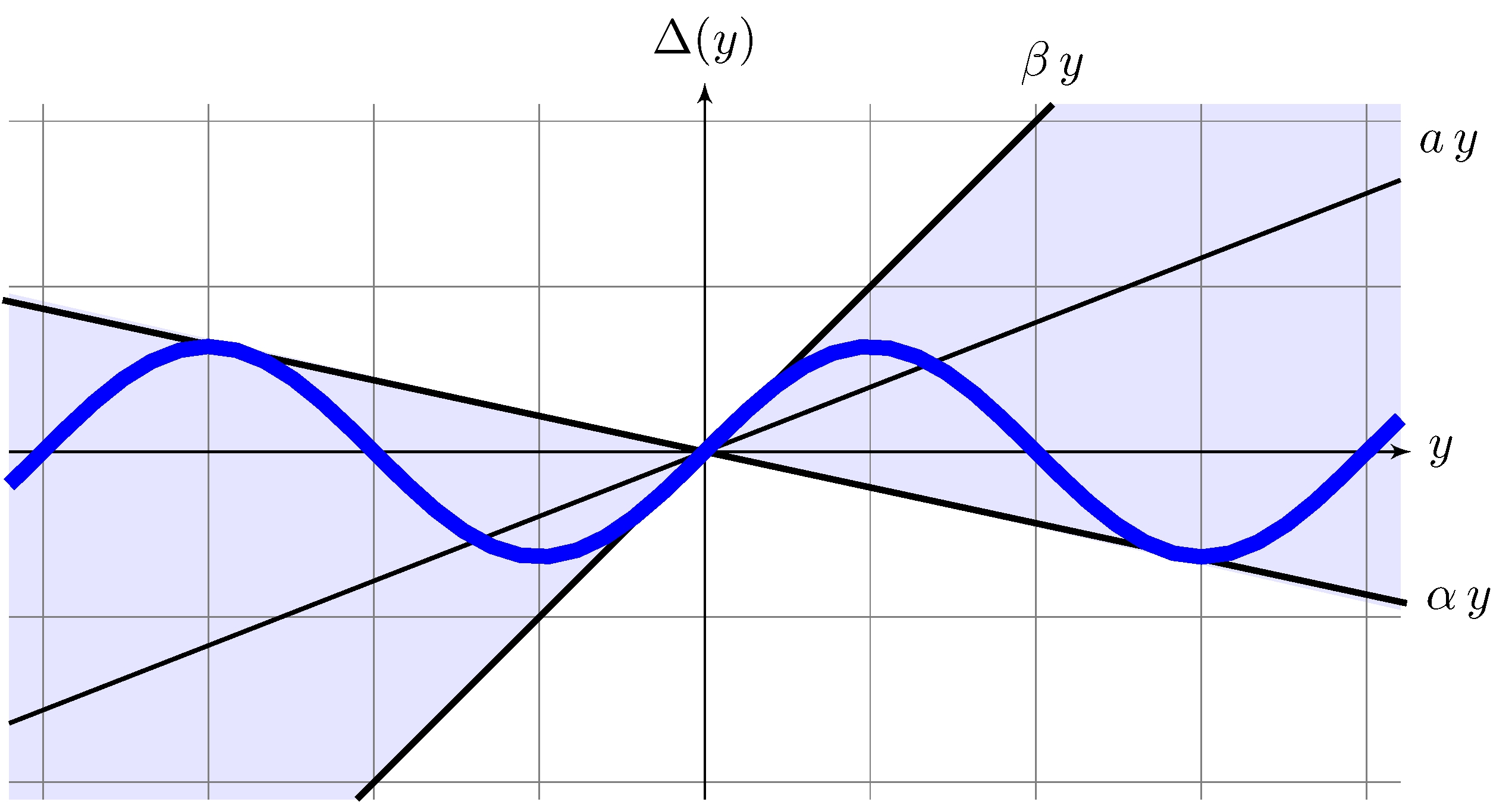 \[\begin{align*} \boldsymbol{\Delta}_{ab}(a,b) &= \{ \Delta: \mathbb{R} \rightarrow \mathbb{R}, \quad | \Delta(y) + a y | \leq b |y|, \quad b > 0 \}, & (a, b) &= ( {\textstyle\frac{1}{2}}(\alpha + \beta), {\textstyle\frac{1}{2}}(\beta - \alpha) ) \\[1ex] \boldsymbol{\Delta}_{\alpha\beta}(\alpha,\beta) &= \{ \Delta: \mathbb{R} \rightarrow \mathbb{R}, \quad (\Delta(y) - \alpha y)(\Delta(y) - \beta y) \leq 0, \quad \beta > \alpha \}, & (\alpha, \beta) &= (a - b, a + b) \end{align*}\]