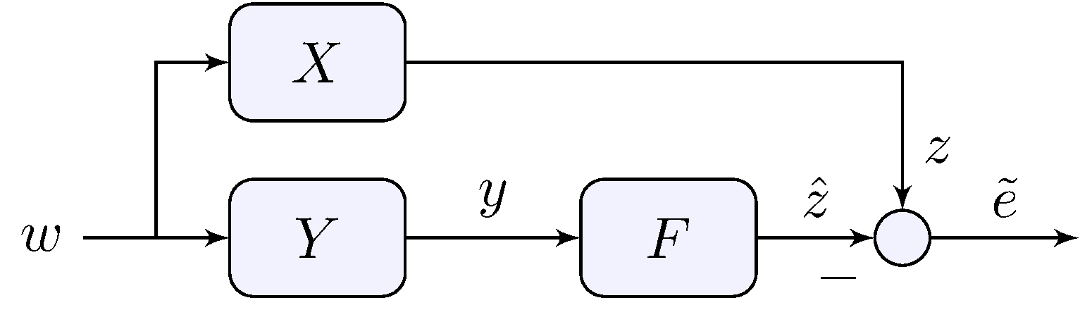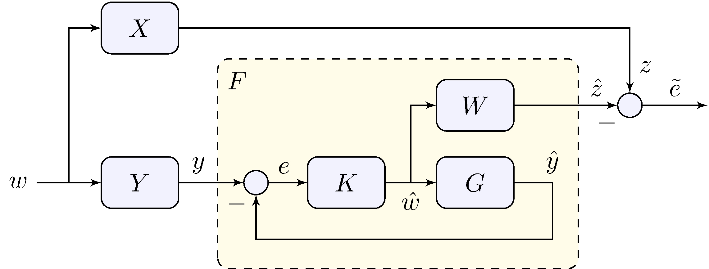 \[\begin{align*} e &= S \, \bar{y} - (W - F \, G ) \, S \, w, & S &= (1 + G \, K)^{-1} \end{align*}\]