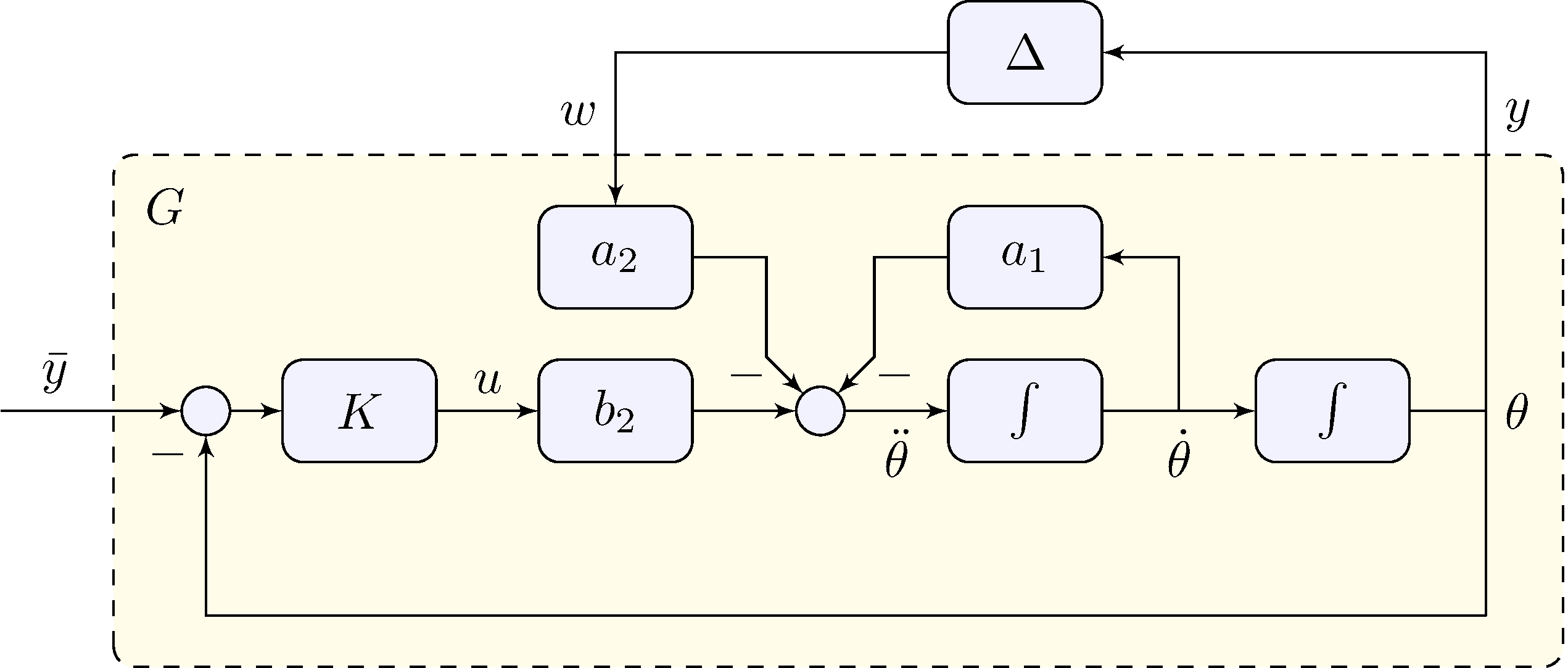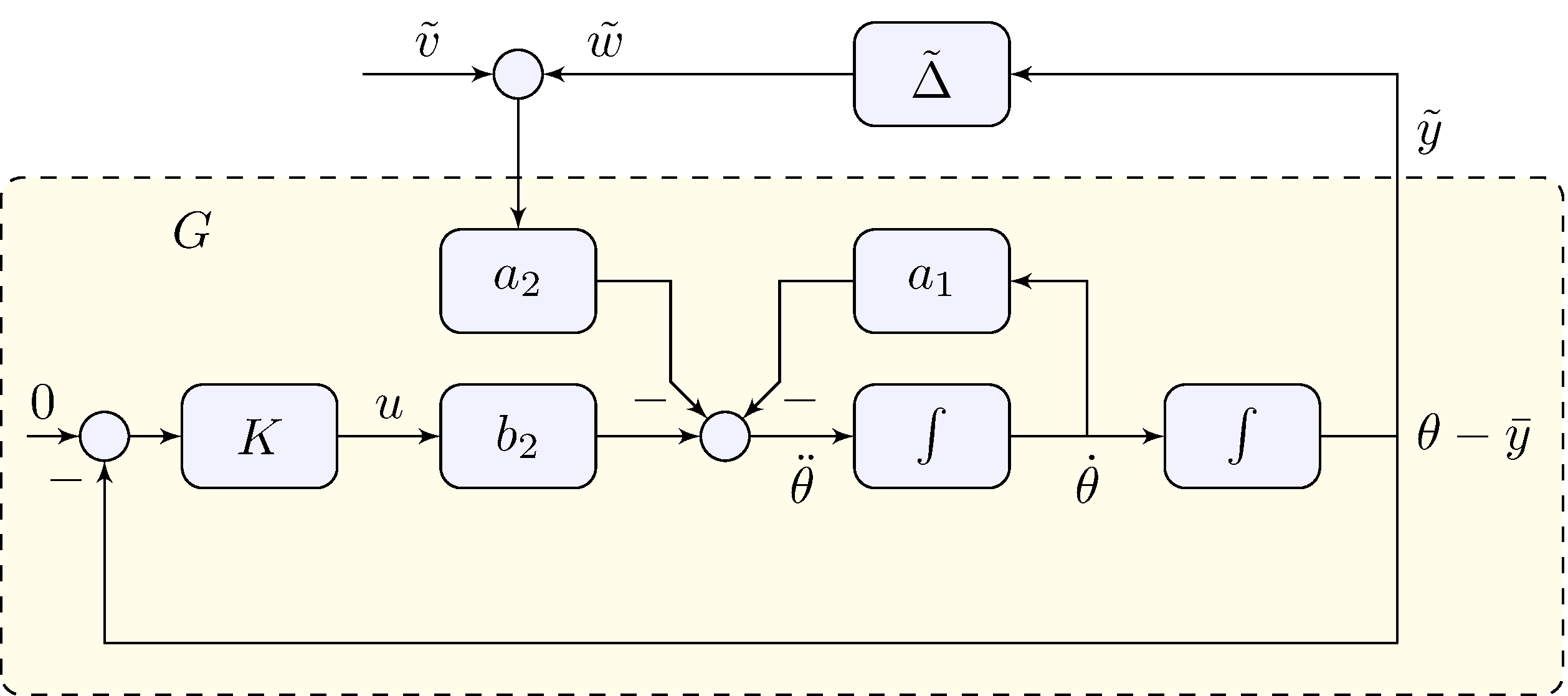 \[\begin{align} \label{eq:gpendulum} G(s) = \frac{Y(s)}{W(s)} &= \frac{- a_2 F(s)}{1 + b_2 K(s) F(s)}, & F(s) &= \frac{1}{s^2 + a_1 s} \end{align}\]