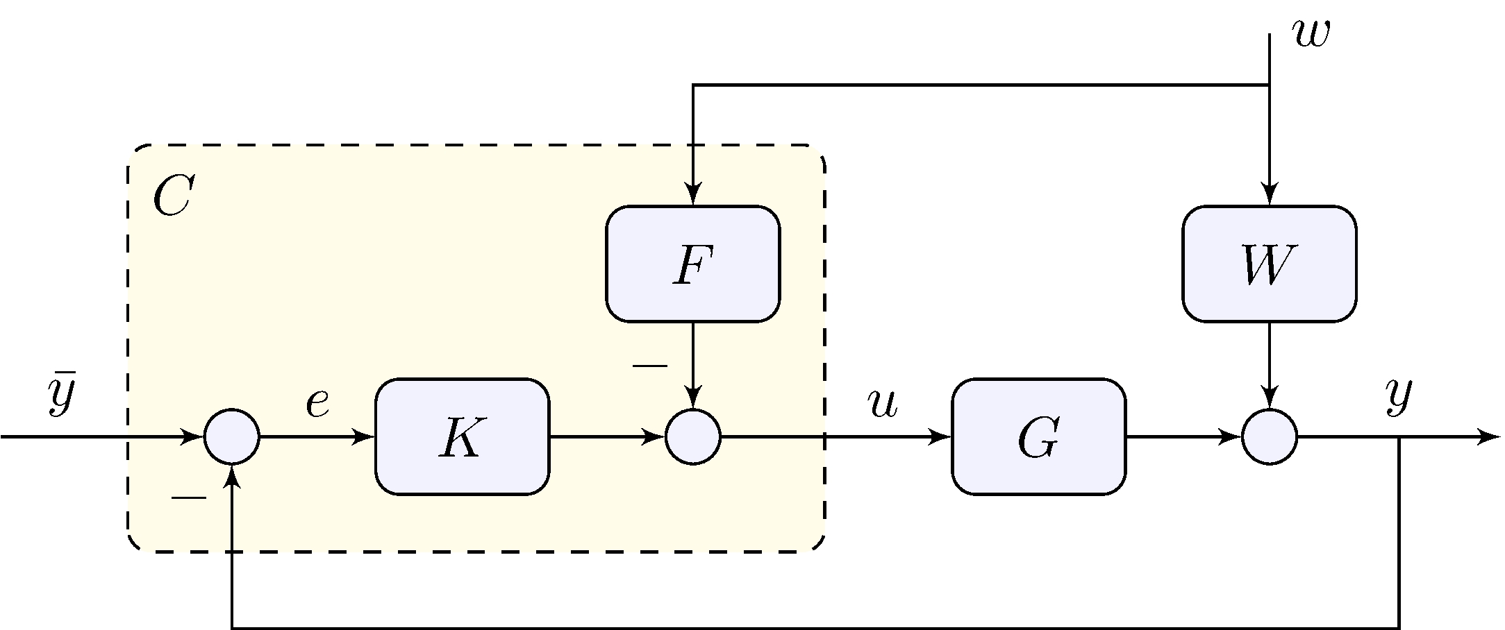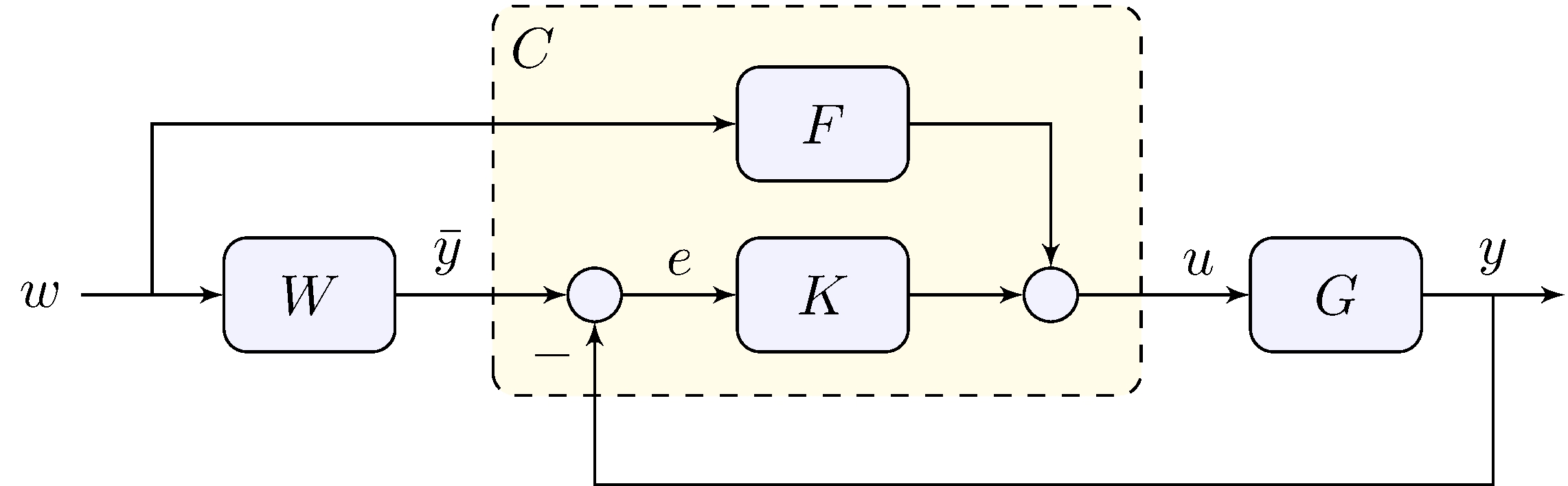 \[\begin{align} W &= X, & G &= Y, & \tilde{e} &= W S w, & S &= \frac{1}{1 + G \, K} \end{align}\] e.g. \(K\) or \(G\) have a pole at zero then \(\lim_{t \rightarrow \infty} \tilde{e}(t) = 0\)
