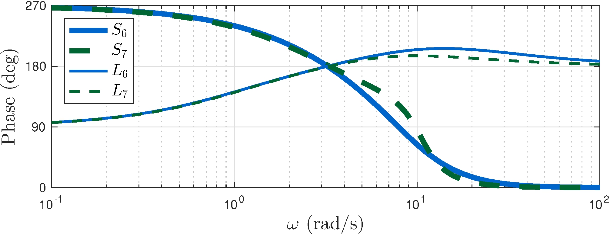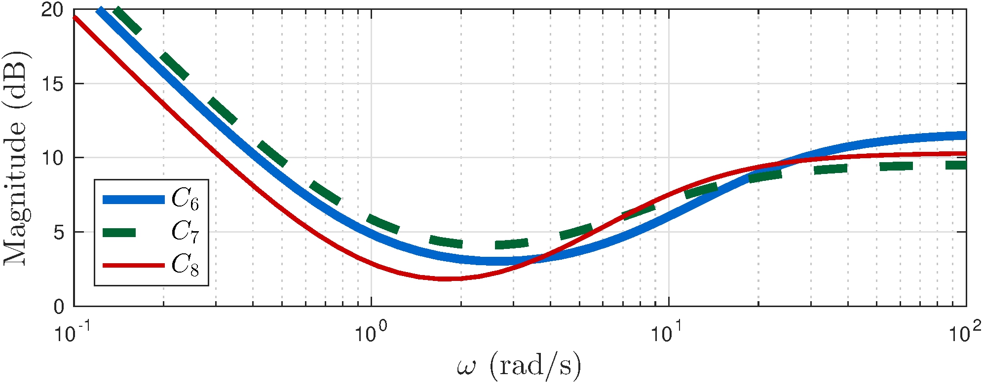\[\begin{align*} C_6(s) &= 3.83 \frac{(s+0.96)(s+6.86)}{s \, (s+21)} \\ C_7(s) &= 3 \frac{(s+1)(s+5)}{s \, (s+11)} \\ C_8(s) &= 3.28 \frac{(s+1)(s+3)}{s \, (s+10.5)} \end{align*}\]
